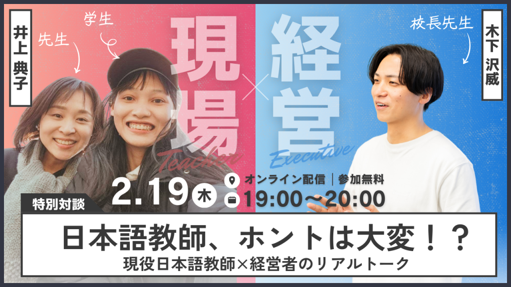 本イベントでは、 現役日本語教師と日本語学校経営者が対談形式で、 日本語教師の仕事の中身や、一般企業との就活の違い、 現場で実際に感じているリアルを整理していきます。