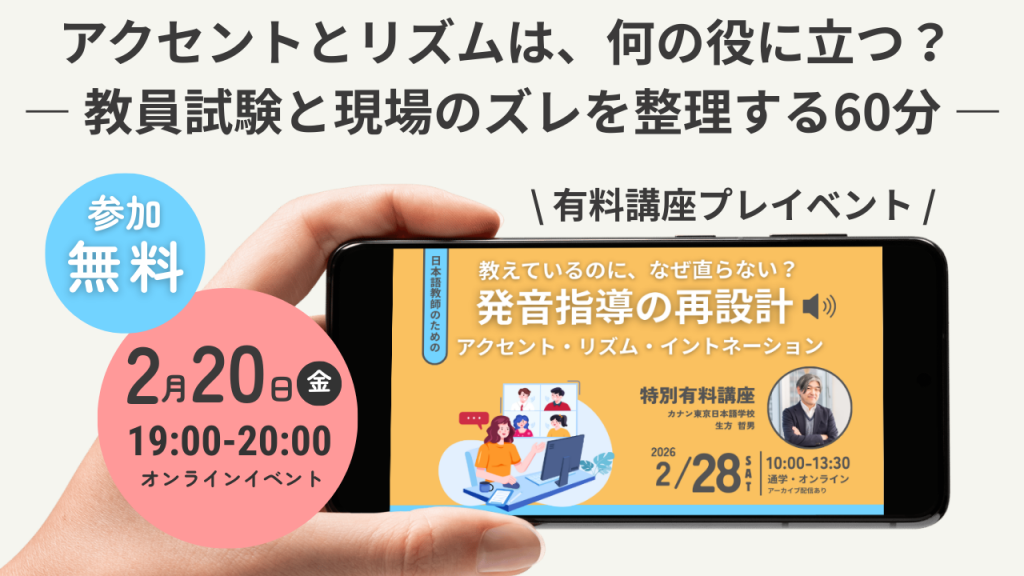 この無料イベントでは、 試験で扱われる音声知識と 現場で求められる指導を対比しながら、 アクセント・リズムの位置づけを整理します。