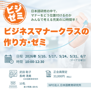 日本語教育研究所では、今までに多くの企業より研修の委託を受け、ビジネス日本語研修を実施してきました。 その経験を生かして、「日本人と働くときに知っておいたほうがいいこと」を 『留学生・日本で働く人のためのビジネスマナーとルール』という1冊の本にまとめました。 2023年2月には、時代の流れを反映した『改訂版 留学生・日本で働く人のためのビジネスマナーとルール』を出版し、 現在までに多くの皆さんにお使いいただいています。 この講座では、本書の著者がテキストの項目を中心に、実体験をもとにさまざまなビジネスマナーの扱い方を紹介するとともに、 実際にどう研修の中に落とし込むのか、その展開方法をみなさんと考えていきます。 「学びあう」のがこのゼミです。 ■講座の目標■ この講座を受けることで以下のことができるようになります。 ・外国人が誤解を受けやすい文化の違い、考え方の違いを理解する ・文化や考え方の違いの効果的な伝え方がわかる ・1つのトピックについて、さまざまな授業展開の方法がわかる ・日本語研修の中で、マナーをどう位置付けるのかがわかる ■進め方■ 1.扱う項目について、テキストをじっくり読み、分析シートに入力し提出 2.担当受講者がファシリテーターとなり、小グループでのディスカッション 3.全体ディスカッション、および講師からコメント ■講師■